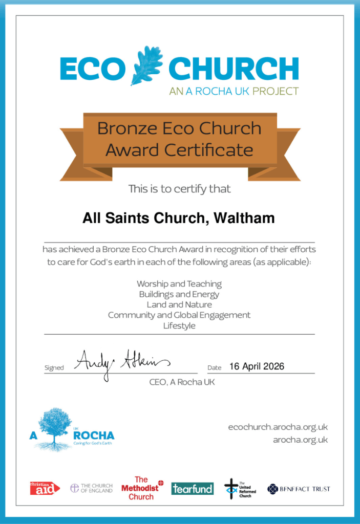 All Saints church has been awarded a Bronze certificate for the church communities ecological efforts in and around the church. Picture below Reverend Pauline Cummins with some members of All Saints Church PCC